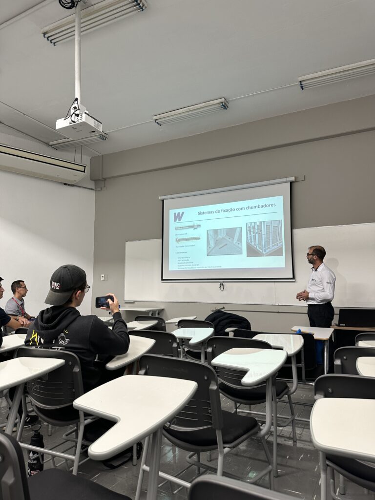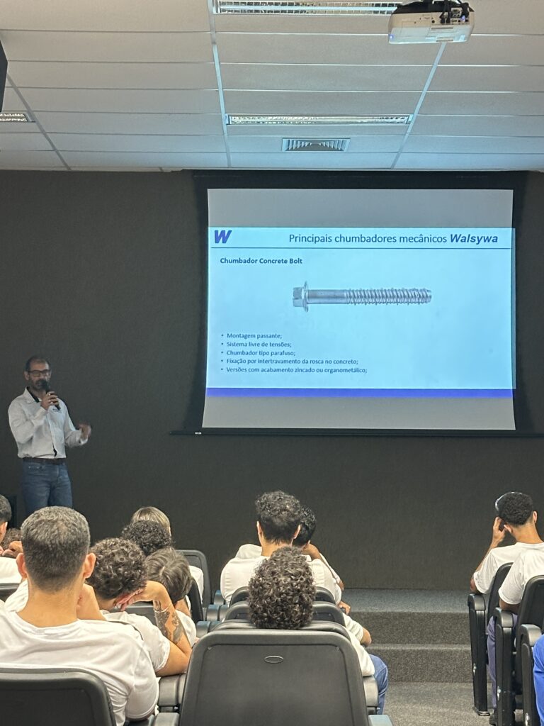 As palestras são expositivas, com o apoio de apresentações e vídeos de aplicação dos produtos Walsywa, mostrando na prática como nossas soluções são aplicadas no concreto e no aço estrutural. Além disso, os alunos têm a oportunidade de participar de algumas demonstrações práticas, manipulando ferramentas e chumbadores, vivenciando o funcionamento e a eficiência das principais linhas de produtos da marca.