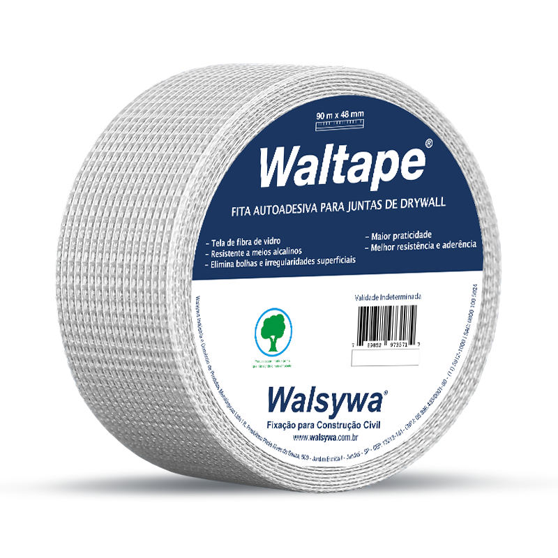 A Fita Waltape é uma Fita telada composta por fios de fibra de vidro entrelaçados (formando uma malha), com uma das faces autoadesiva, destinada ao tratamento de juntas entre placas Drywall em paredes ou tetos.