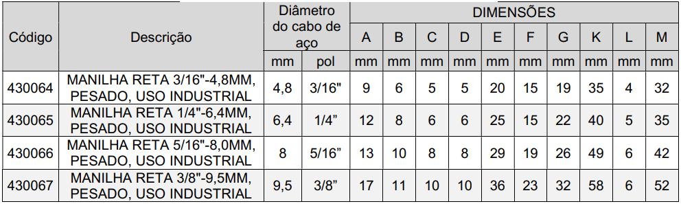 A manilha reta é um acessório de fixação utilizado na ancoragem, movimentação e união de cabos de aço, seu formato arredondado permite melhor acomodação dos cabos, reduzindo pontos de tensão e garantindo maior segurança durante o trabalho, fabricada em aço carbono de alta resistência, suporta grandes esforços mecânicos e oferece excelente durabilidade, possui pino roscado ou cavilha de segurança, garantindo travamento confiável e fácil montagem no campo.